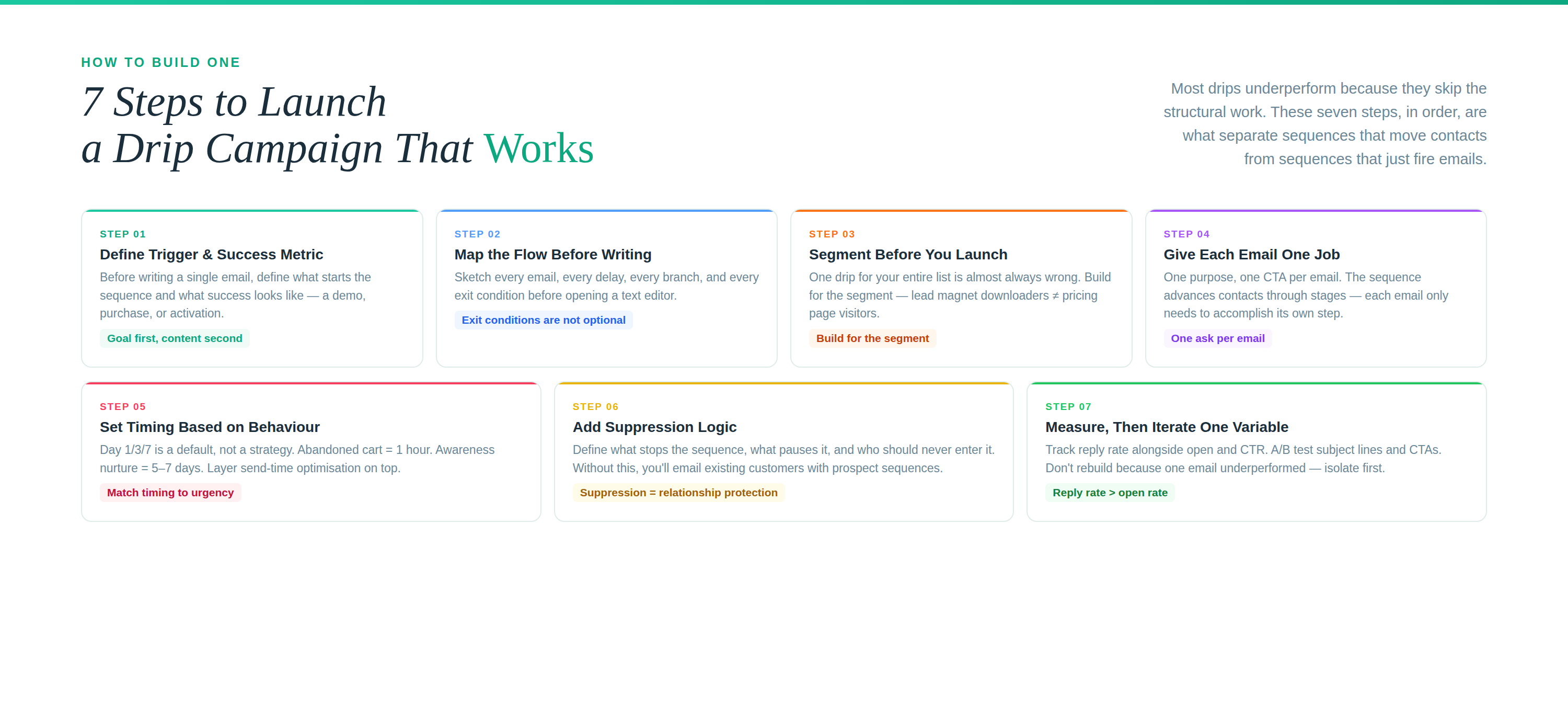 A drip without suppression rules is an automation liability. Define: what stops the sequence (goal completed, purchased, unsubscribed), what pauses it (bounce, complaint threshold), and who should never enter it (existing customers for a prospect sequence, churned users for an upgrade flow).