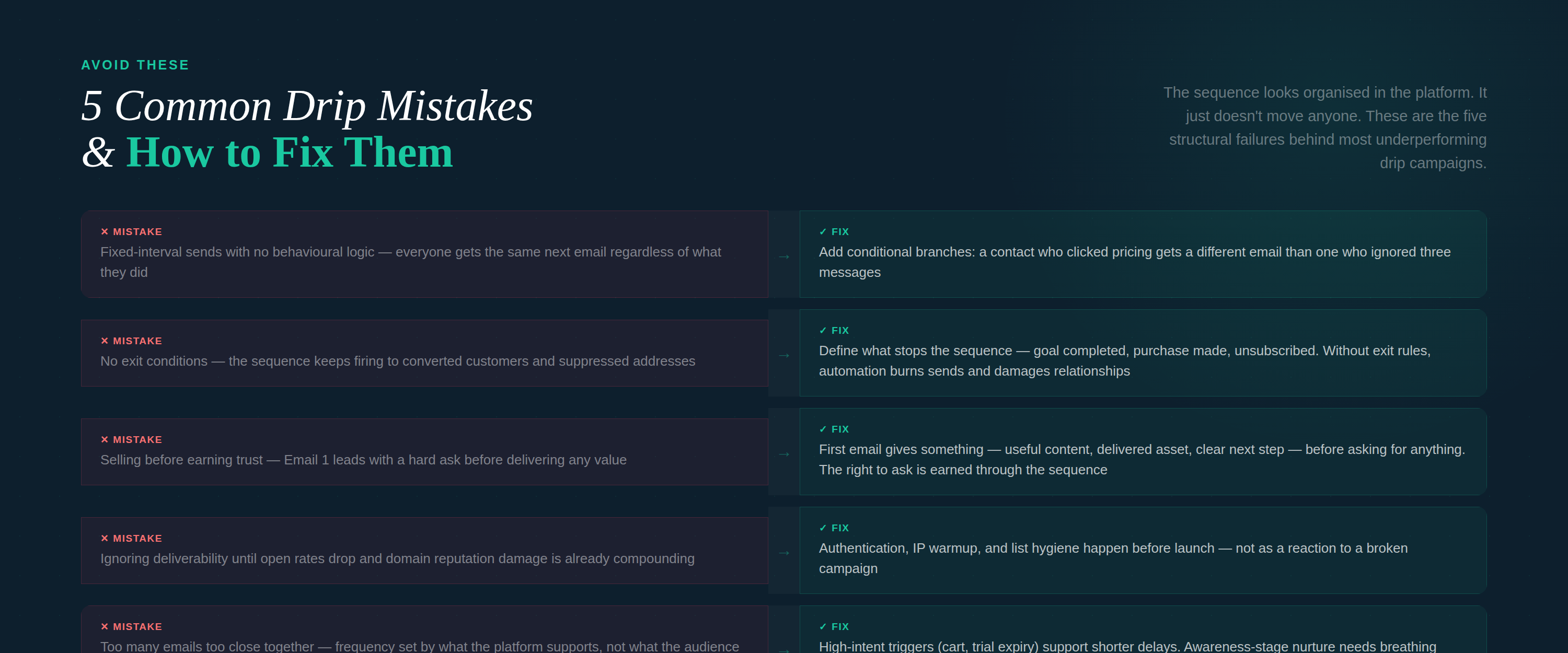 The problem isn’t awareness. Most marketers know drip campaigns work. The problem is execution — fixed-interval sequences with no behavioral logic, no suppression rules, no deliverability foundation. The sequence looks organized in the platform dashboard. It just doesn’t move anyone.