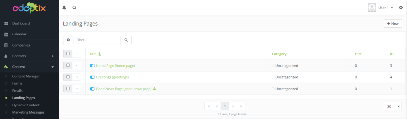 Go to your Adaptix Menu on the left hand-side of the page, under “Content”, select “Landing Pages”. You will be navigated to the Landing Pages dashboard.