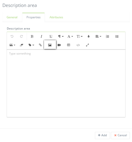 Select the form you want to add an image to and then add the field “Description Area”. Fill in the required field (Header) and then open the “Properties” tab. Here you can add an image by selecting the image icon. Upload the image, when you are done click “+ Add”.