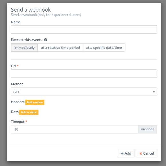 The “Send a webhook” action will pop up (shown in the image above). Fill out the required field values, the URL and Timeout. When you are done filling out the information, click “+ Add”. Your action to “Send a webhook” will be added to your automation.