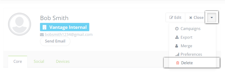 - Open up the contacts profile, by clicking on the contacts name, and click the down arrow located in the top right of the page. This will bring you to a drop down menu.
