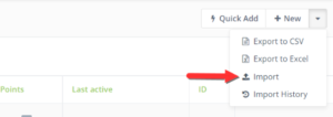- Go to Contacts .In the top right corner above the table of Contacts open the sub menu of actions and select the Import option.