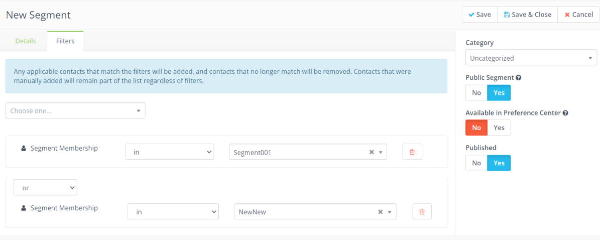 - Set your filters to “Or” to allow contacts from either segment to be in the new segment